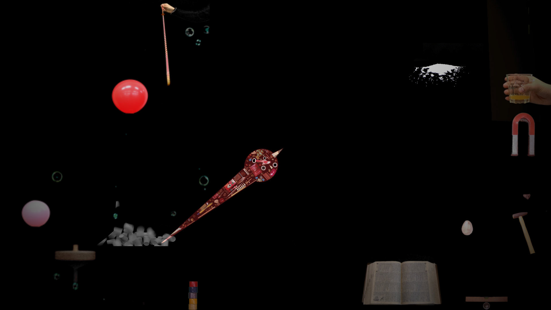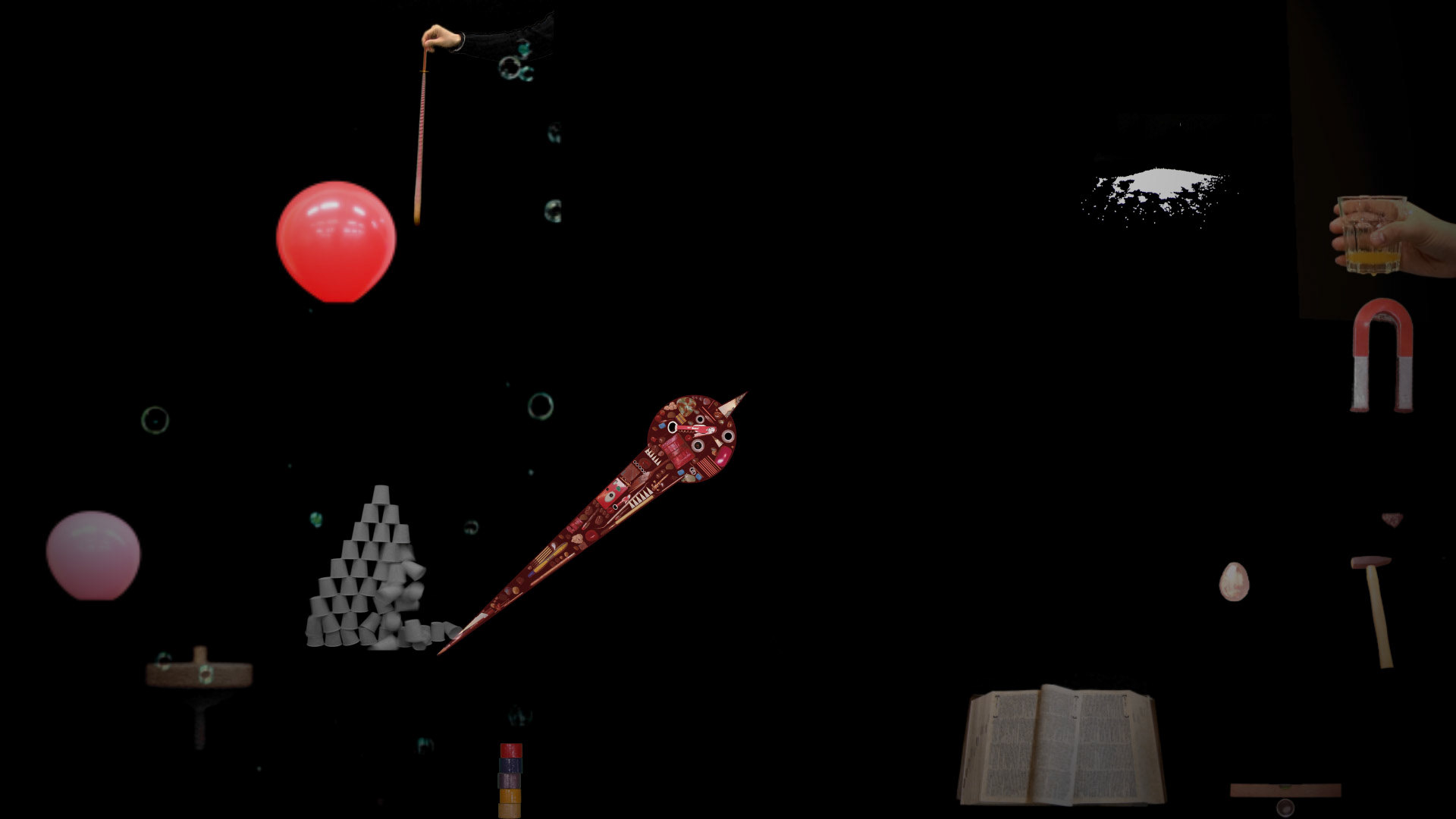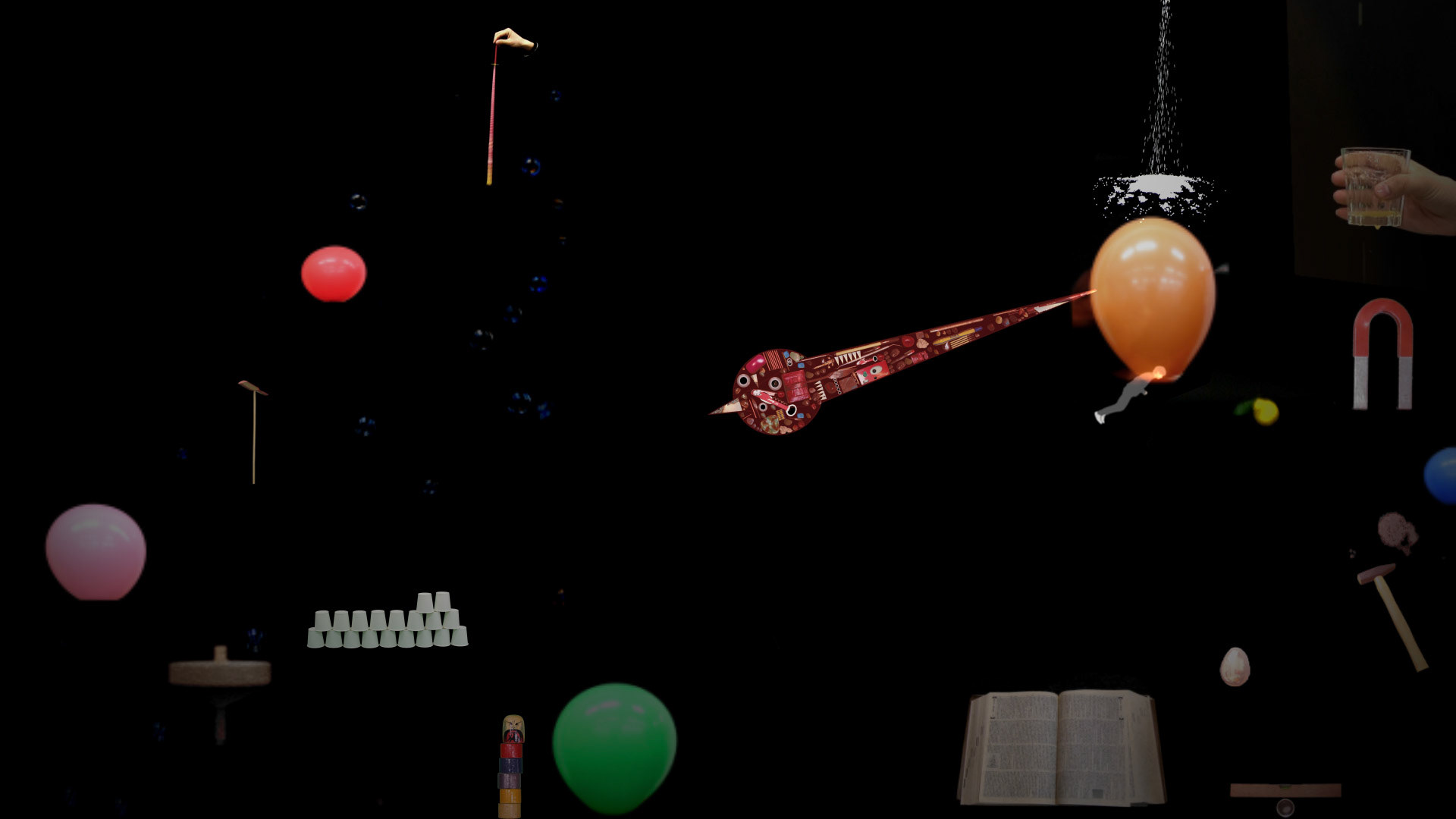 時間という概念を複合的に捉え、視覚と聴覚の面から アプローチした。画面の中の様々な出来事が、時計の針の動きに作用される。